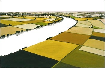Every morning for the past fourteen years I have gazed at one of Will Steiger’s riverbends—a stunning mosaic of parceled farmland marked by abstracted trees and a curving white river against a blank horizon. The picture is a powerful drama about ingenuity and dominance. The natural world has been reduced to geometry, yet the geometry cannot hold back a river’s mighty force. Abstraction and realism are so precisely balanced that they work on me almost hypnotically, transporting my mind to real and imaginary places. I soar above the Midwest in a single-engine plane. I am in a novel about the anxiety of dislocation such as Winesburg, Ohio or Sister Carrie.