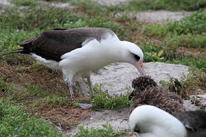 ![]() Wisdom, the albatross, preening her chick. Image: FWS Refuge biologist, Pete Leary |