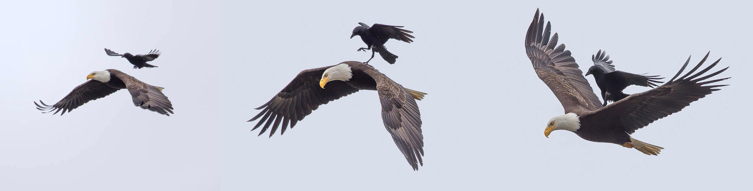 Typically when something like this happens “the eagle or other large bird being harassed will react in an aggressive way,” Kaufman says. Or, the larger bird will ignore its tormentor, “just as we might ignore a small dog yipping at our heels,” adds Kaufman—which very well may be what was happening in this photomontage.