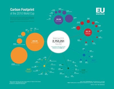 The South African World Cup is responsible for six times the emissions of the previous one, totaling 2,753, 251 tons of CO2 (equivalent to annual greenhouse gas emissions from 500,000 cars). With attendance topping 3 million, the influx of fans flying in from all corners of the globe is largely to blame. But other factors contributed to the larger footprint, including energy production (South Africa relies heavily on coal, whereas Germany is a leader in renewables) as well as construction.