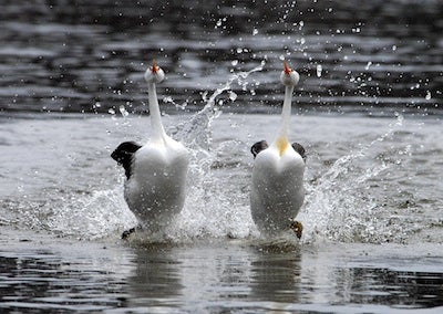 Just like Western grebes, Clark's grebes have a dramatic, choreographed courtship display, in which the birds rush across the water with their long necks extended. Photo: Dave Menke/USFWS