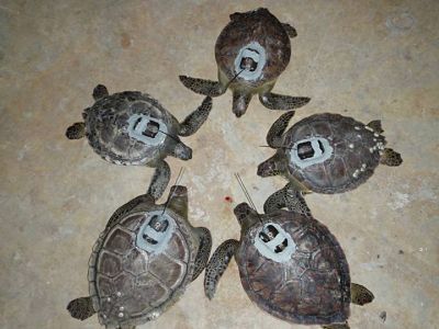 Five juvenile green sea turtles fitted with satellite transmitters. The BP Deepwater Horizon Oil Spill put this endangered species at even greater risk. Photo: April Goodman/NOAA