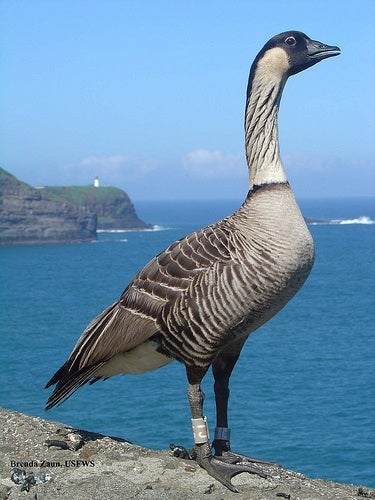 The endangered Nene (Hawaiian goose) poses in front the Kilauea Point Lighthouse. Photo: Brenda Zaun, USFWS/CC BY 2.0 |