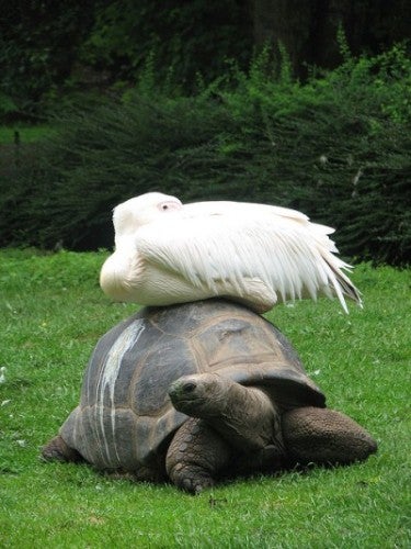 Every week we post a funny animal photo that's begging for a caption. This week’s stars are a pelican and a tortoise. Join in the fun and add your suggestion in the Comments section below. You’ve got til 11:59 (Eastern time) on Sunday. On Monday we'll choose our three favorite captions and list them under the image.
