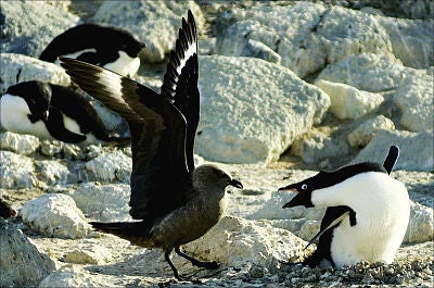 A South Polar Skua tries to push an Adélie penguin off its nest to steal its egg. Skuas migrate in a clockwise loop from Japan to North America. Off Washington State, peak migration occurs from late August to early October, although birds have been spotted as early as mid-May, according to Seattle Audubon Society. Credit: Melanie Conner/National Science Foundation