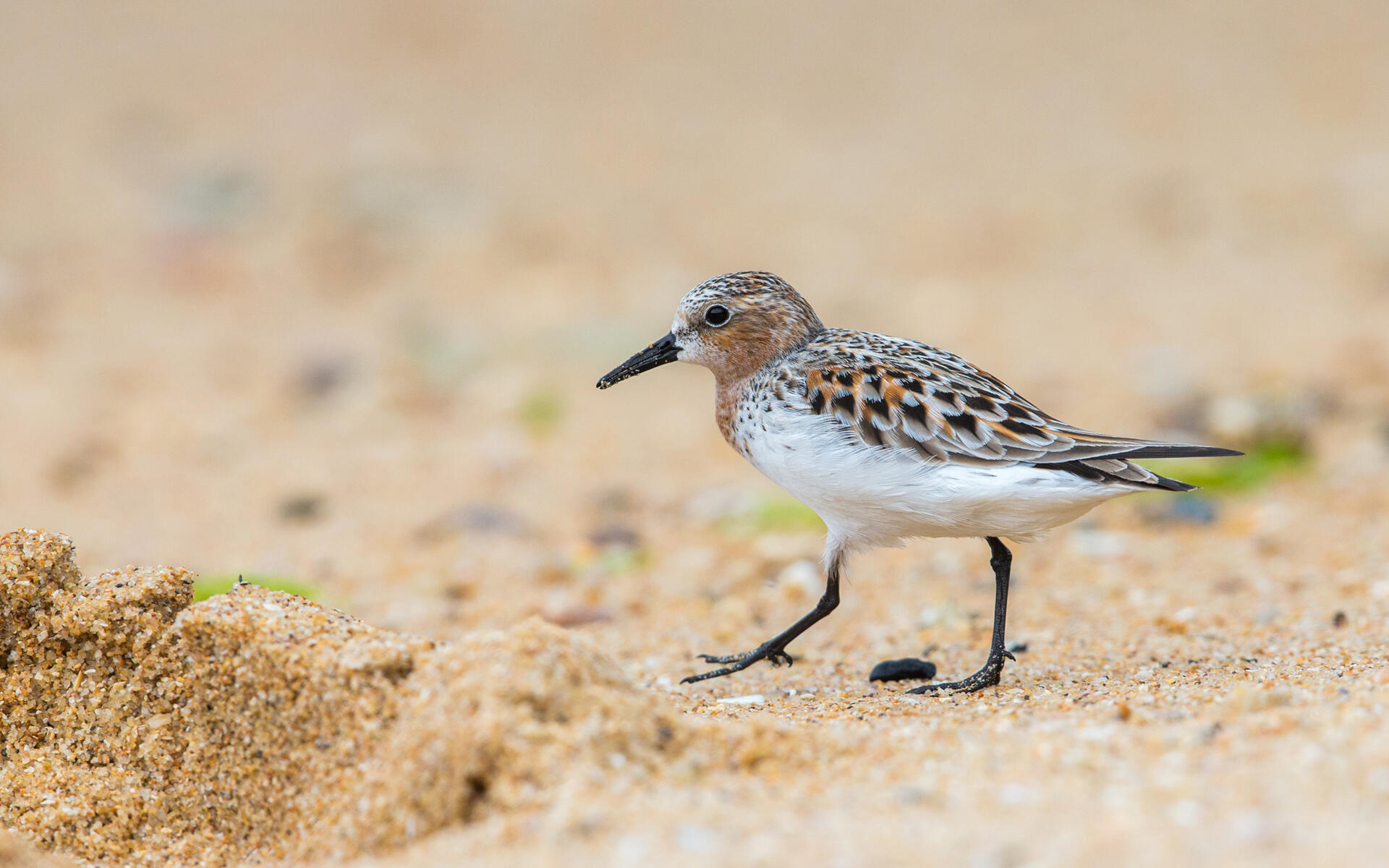 Forages by walking, usually on shore rather than in shallow water, picking rapidly at tiny items on surface. Sometimes probes in mud with bill.