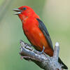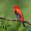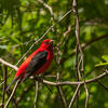 In courtship, male hops about on branches below perched female, with wings drooped and tail partly spread, showing off contrast between red back and black wings and tail. Nest site is in tree (usually deciduous), typically 20-30' above ground, sometimes lower or much higher. Placed on horizontal branch, usually well out from the trunk. Nest (built by female) is a shallow open cup of twigs, weeds, grass, lined with fine grass and rootlets.