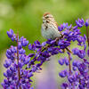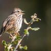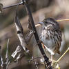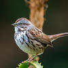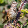 Males often defend only small nesting territories, so high densities of Song Sparrows may be present in good habitat. In courtship, male may chase female; may perform fluttering flight among the bushes with neck outstretched and head held high. Nest site varies, usually on ground under clump of grass or shrub, or less than 4' above the ground, sometimes up to 10' or higher. Raised sites may be in shrubs, low trees, or marsh vegetation, often above water. Rarely nests in cavities in trees. Nest (built mostly or entirely by female) is an open cup of weeds, grass, leaves, strips of bark, lined with fine grass, rootlets, animal hair.