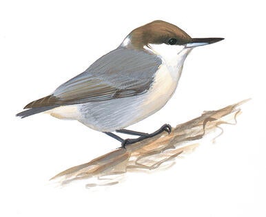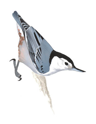 Nesting pairs often joined by 1-3 additional birds, usually their previous offspring, which help to defend the territory and raise the young; these helpers may roost in nest hole with the pair before the eggs hatch. Pairs with helpers tend to fledge more young than pairs without. Nest: Both sexes help excavate nest cavity in dead limb or snag, 8-60' above ground, usually higher than 20'. May tolerate some hole-nesting birds quite nearby (bluebirds, swallows) but not chickadees or other nuthatches. Nest in cavity is made of bark fibers, plant down, feathers. Pair usually roosts at night in nest cavity prior to egg-laying.