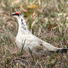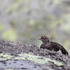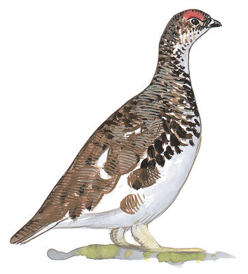 Male defends territory in spring with conspicuous display flight: flaps very rapidly, glides high, then flutters to ground while giving staccato call. In courtship display, male raises red combs above eyes, fans tail, and walks in circles around female, dragging one wing on ground. Nest site is on ground in relatively barren, rocky area, usually near large rock. Nest (built mostly by female) is shallow depression, lined with small amounts of moss, lichen, grass, feathers.