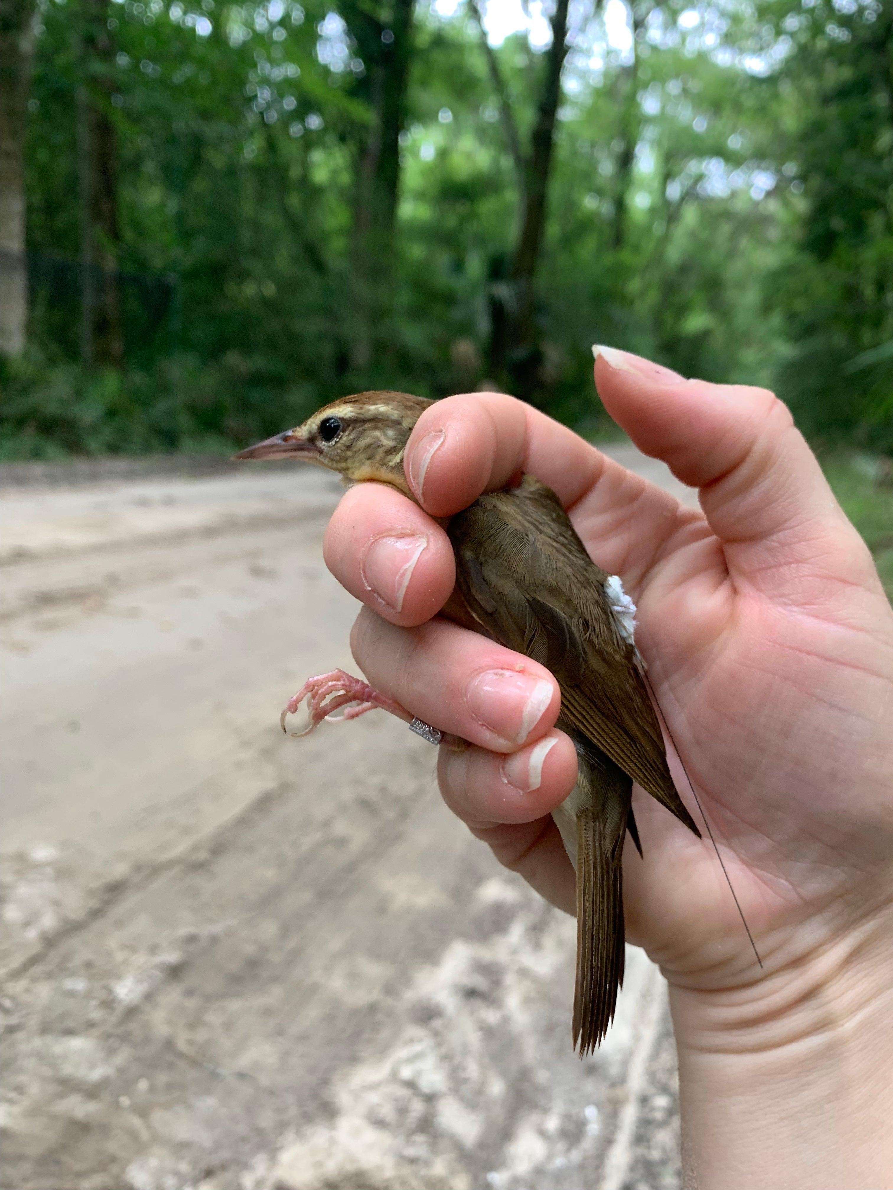 Swainson's Warblers are very secretive warblers that live in thick dense forest understories. Their habitat of choice is often difficult for people to get too, as their preferred homes may require a machete to navigate, and their closest neighbors are venomous snakes, mosquitoes, and ornery feral hogs. This earns them the nickname "ghost bird" by many birders, as they're difficult to find for their lists. Swainson's Warblers eluded birders and scientists, with little being known about their migration routes, timing, and wintering locations. Though a collaborative effort across their breeding range, we partnered with other orgs to track them using a brand new piloted technology, barometric light level geolocators. You can read more about these in our blog post about the project. If you're a land owner and want to bring these birds to your property, we have proven Bird-friendly Forestry techniques that replicate their ideal habitat.