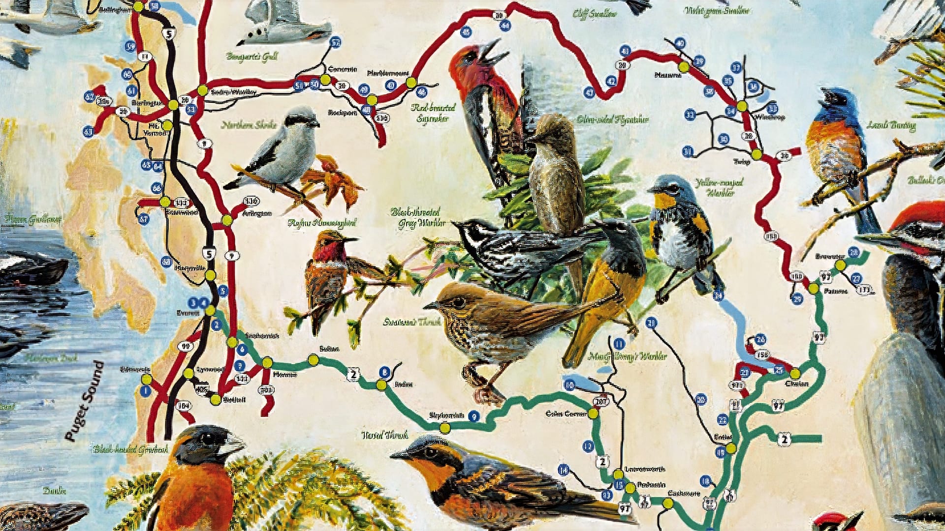 The map features original art by Ed Newbold on the cover and along the route of the map. Thank you to the many dedicated Birding Trail volunteers, and to the program funders: U.S. Fish and Wildlife Service, Washington Dept. of Fish and Wildlife, Washington’s office of Business and Tourism Development, Icicle Fund, Puget Sound Energy, and many individuals.