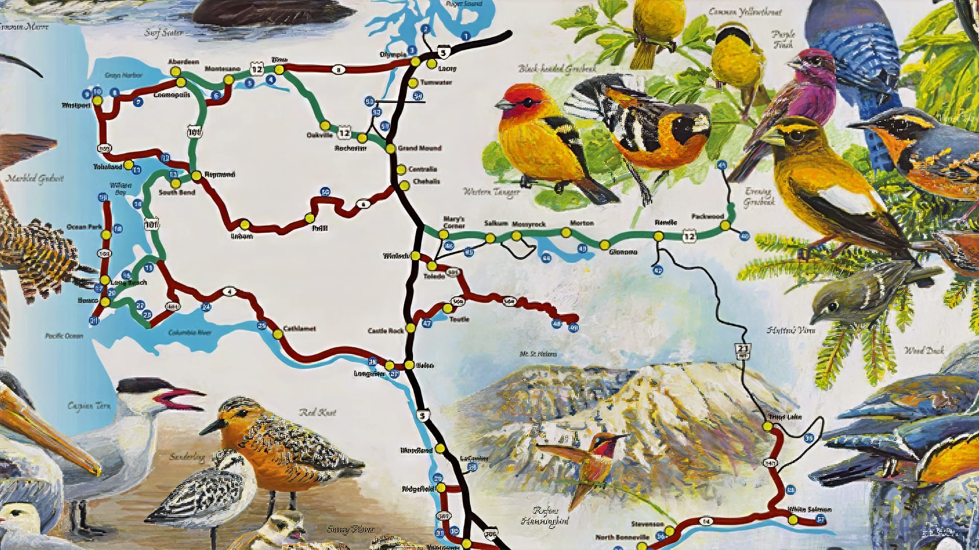 The map features original art by Ed Newbold on the cover and along the route of the map. Thank you to the many dedicated Birding Trail volunteers, and to the funders: Washington Dept. of Fish and Wildlife, State Parks Commission, Clark and Grays Harbor Counties, the Cities of Aberdeen, Lacey, and Olympia, and our many individual contributors.
